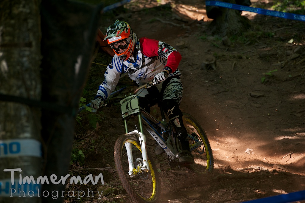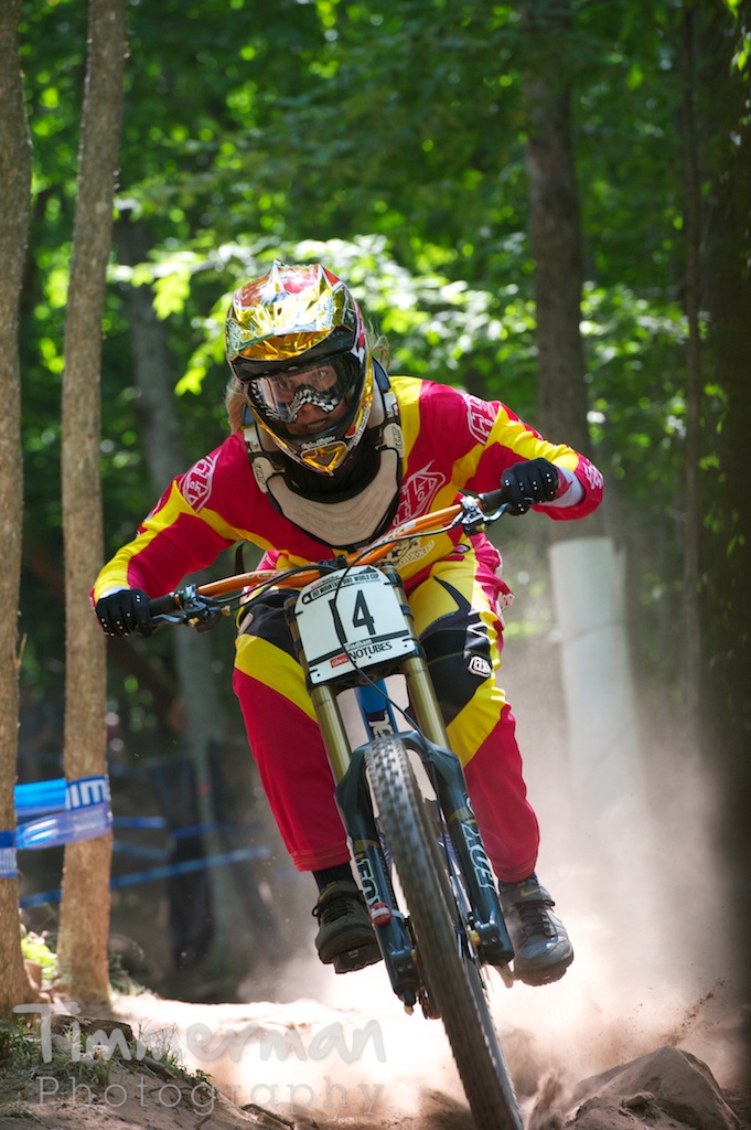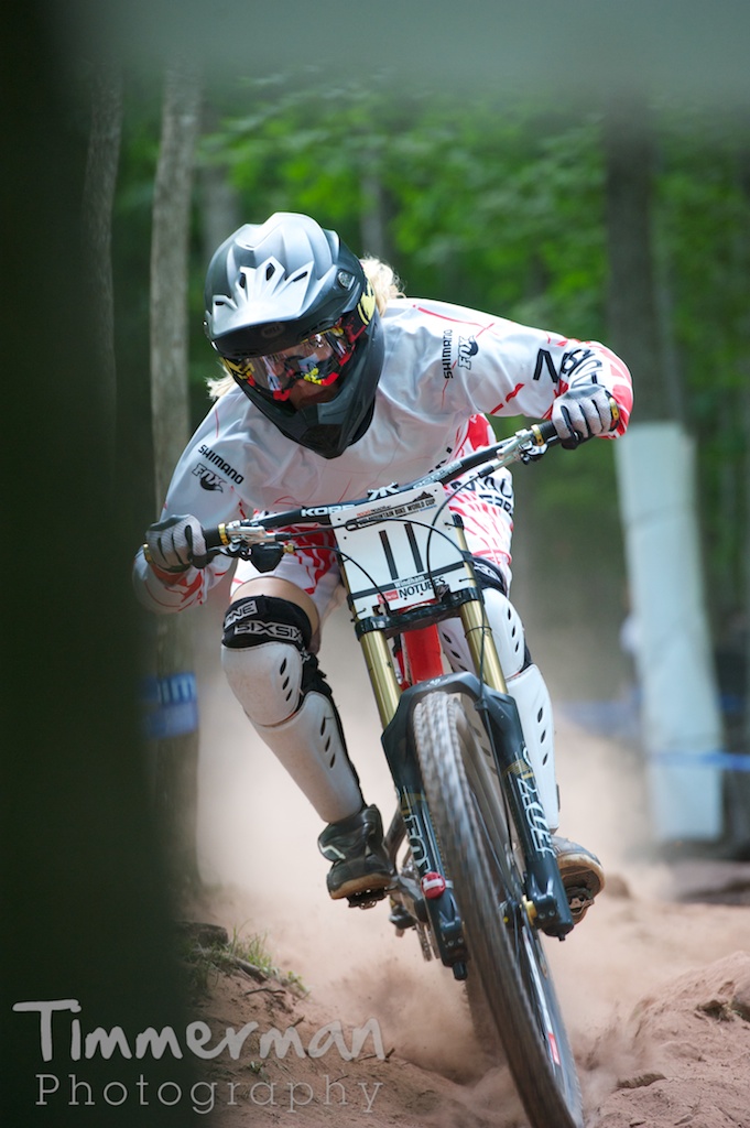 Jill Kintner was on a nice run with a 7th place at Mont Sainte Anne. She looked very fast and calm at Windham and was having a lot of fun on the jumps. Being one of the bigger/stronger girls and as an Olympic medalist in BMX, Sunday seemed like it was really shaping up to be good for her. When I felt the headwind on the lower jump section, I knew it would be a tough day for the elves like Ragot and Hannah. Sadly, Jill slipped out in a corner below the road gap and snapped her arm. She’ll be back though!