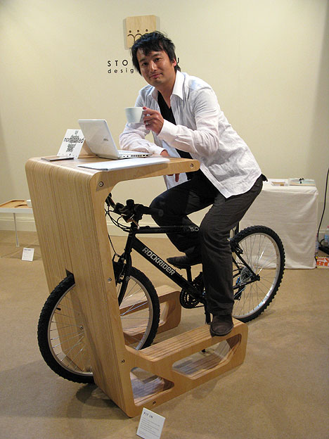 The STORE MUU design studio in Tokyo, Japan, has recently crafted the “Pit In” work station which allows you to pull your bike right up to your computer. It’s sleek, functional and we figure with an easy modification in the form of a stationary bike trainer, you’ll be able to ride and work at the same time. (We recommend the Forza Bicycle Trainer, if only because the salesman looks like Andre the Giant’s little brother. See video below.)